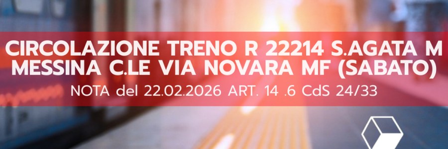Spett.lI Dipartimento Trasporto Ferroviario Regionale Servizio 2°, RFI – DOIT Palermo, Trenitalia SpA Direzione Business Regionale e Sviluppo intermodale Direzione Regionale SICILIA Il nostro Comitato Pendolari Messina Palermo Gruppo Comitato Pendolari Siciliani Ciufer, invia la presente nota, per informarVi che la circolazione del treno R 22214 S.Agata M Messina C.le via Novara MF, (circolante solo… Read More Circolazione treno R 22214 S.Agata M Messina C.le via Novara MF (sabato)