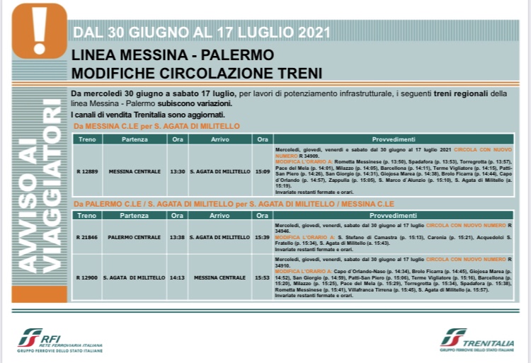 Da mercoledì 30 giugno a sabato 17 luglio, per lavori di potenziamento infrastrutturale, i treni regionali della linea Messina – Palermo subiscono variazioni. Vedi locandina I canali di vendita Trenitalia sono aggiornati.