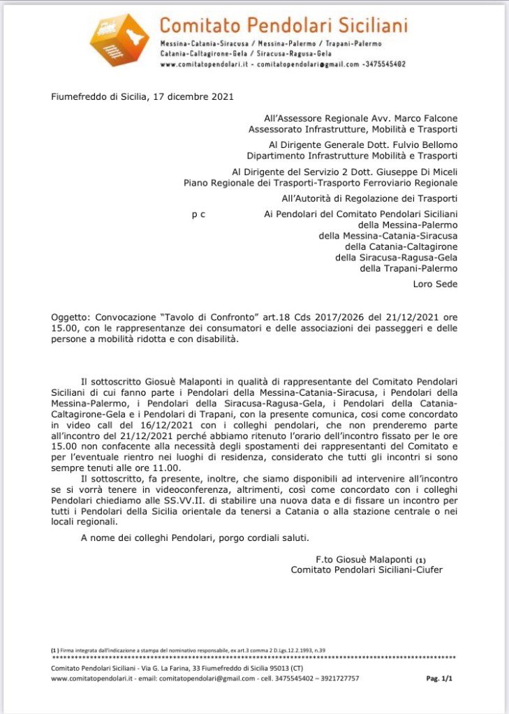 Il sottoscritto Giosuè Malaponti in qualità di rappresentante del Comitato Pendolari Siciliani di cui fanno parte i Pendolari della Messina-Catania-Siracusa, i Pendolari della Messina-Palermo, i Pendolari della Siracusa-Ragusa-Gela, i Pendolari della Catania- Caltagirone-Gela e i Pendolari di Trapani, con la presente comunica, cosi come concordato in video call del 16/12/2021 con i colleghi pendolari, che non prenderemo parte all’incontro del 21/12/2021 perché abbiamo ritenuto l’orario dell’incontro fissato per le ore 15.00 non confacente alla necessità degli spostamenti dei rappresentanti del Comitato e per l’eventuale rientro nei luoghi di residenza, considerato che tutti gli incontri si sono sempre tenuti alle ore 11.00.