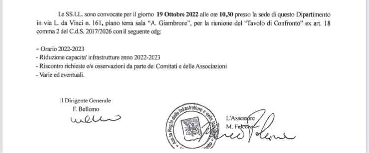 Si è svolto il consueto Tavolo Tecnico di Confronto il 19 ottobre 2022, presso l’assessorato regionale Infrastrutture e Mobilità, con le rappresentanze dei consumatori, dei Comitati dei Pendolari e delle associazioni delle persone a mobilità ridotta e disabilità.