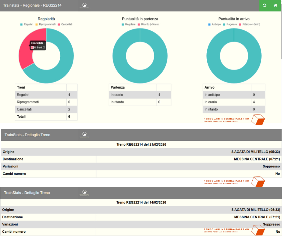 Il nostro Comitato Pendolari Messina Palermo Gruppo Comitato Pendolari Siciliani Ciufer, invia la presente nota, per informarVi che la circolazione del treno R 22214 S.Agata M Messina C.le via Novara MF, (circolante solo nelle giornate di sabato) da Noi monitorato dal 17.01.2025 al 21.02.2026, nel mese di febbraio, nei primi due sabati non è stato effettuato. Vedi tabella: (il ritardo nella tabella riferito alla stazione di termine corsa)
