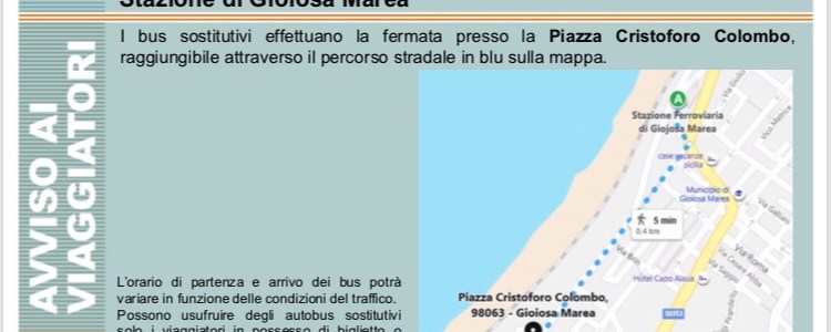 Stazione di Gioiosa MareaI bus sostitutivi effettuano la fermata presso la Piazza Cristoforo Colombo, raggiungibile attraverso il percorso stradale in blu sulla mappa. Stazione di Capo d’Orlando : I bus sostitutivi effettuano la fermata presso Piazza Trifilo Stazione di S. Marco d’Alunzio -Torrenova i bus sostitutivi effettuano la fermata in via Benedetto Caputo angolo SP162… Read More PUNTI DI FERMATA BUS SOSTITUTIVI Stazioni di: Gioiosa Marea (al 10 al 25 luglio 2019) Capo D’Orlando e S.Marco D’Alunzio
