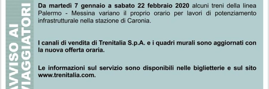 Da martedì 7 gennaio a sabato 22 febbraio 2020 alcuni treni della linea Palermo Messina variano il proprio orario per lavori di potenziamento infrastrutturale nella stazione di Caronia. I canali di vendita di Trenitalia S.p.A. e i quadri murali sono aggiornati con la nuova offerta oraria. Le informazioni sul servizio sono disponibili nelle biglietterie e… Read More Linea Palermo Messina dal 7 Gennaio al 22 Febbraio 2020 Modifiche circolazione dei treni