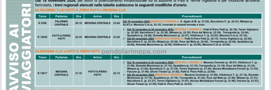 LINEA PALERMO MESSINA da Lunedì 18/25 Novembre modifiche alla circolazione dei treni